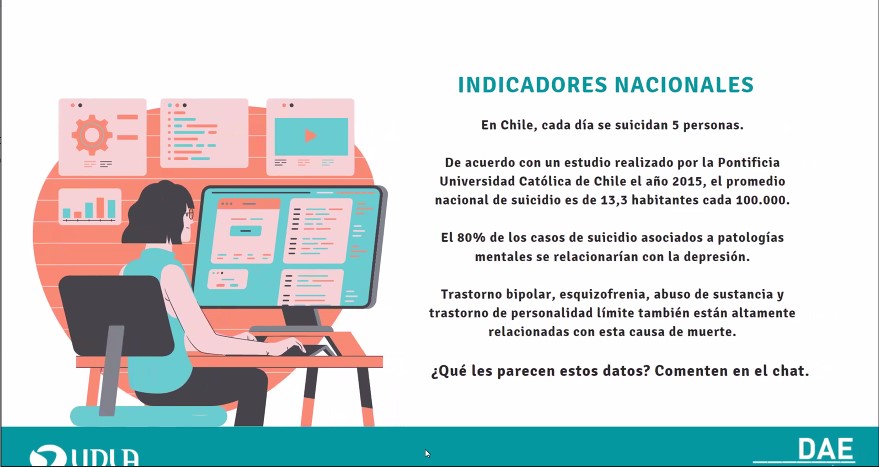 Sobre las activaciones de redes, los expositores compartieron con los asistentes que UDLA cuenta con psicólogos DAE disponibles para la intervención en crisis cuando no existe riesgo de vida. “Para otros casos, está Salud Responde del Minsal (600 360 777), la Urgencia Psiquiátrica del Instituto Dr. José Horwitz y de la Universidad de Los Andes. Ante la desaparición y mensajes de amenaza suicida, recomendamos acudir a la PDI con los datos de la persona y los mensajes de prueba”, explicaron.