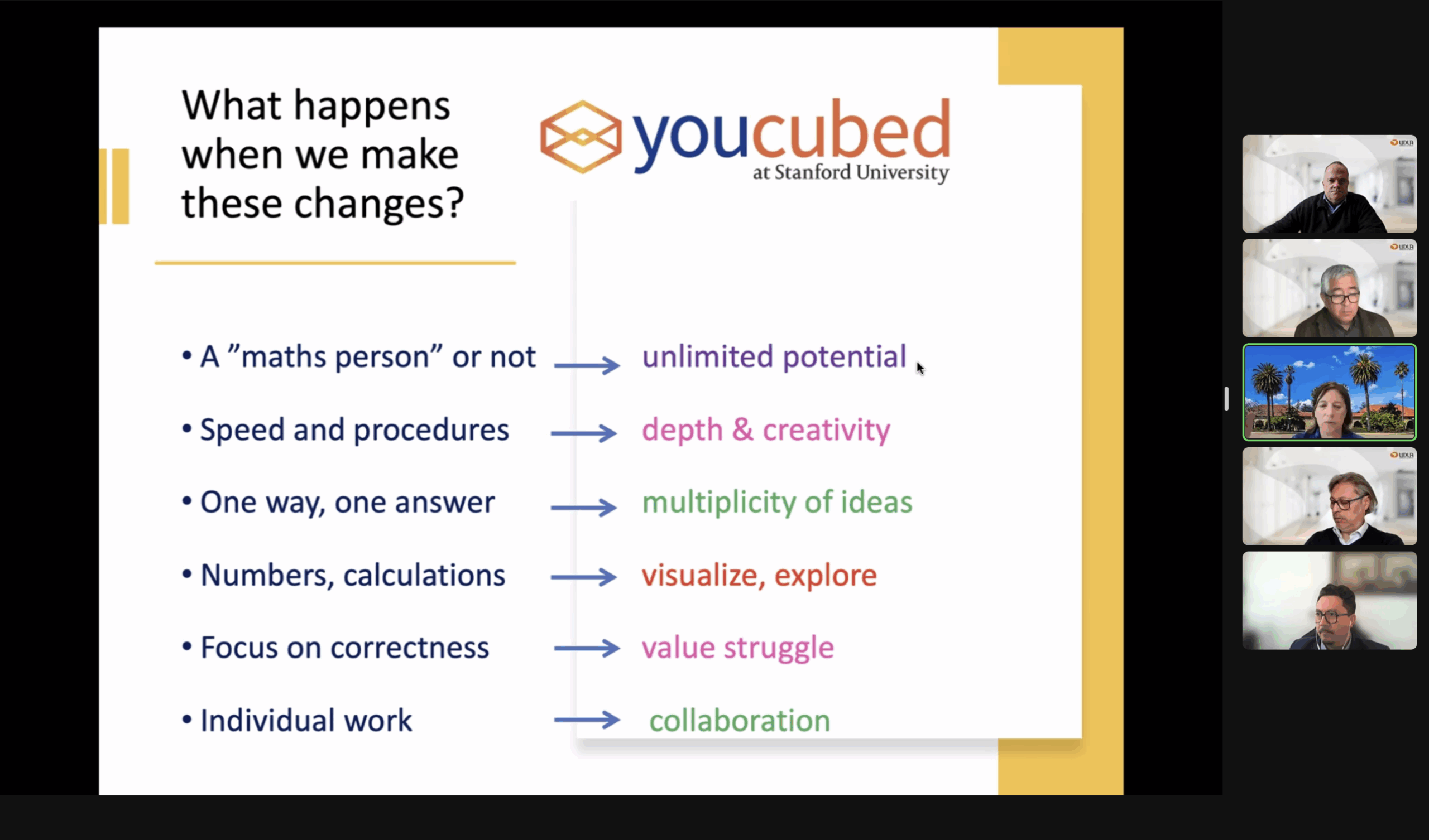 El seminario online contó con la exposición de la destacada profesora Dra. Jo Boaler, académica en la Universidad de Stanford, autora de 18 libros y directora de Youcubed, un recurso educativo que ha llegado a más de 230 millones de estudiantes, y que proporciona herramientas a profesores, padres y estudiantes para despertar el interés por las matemáticas.